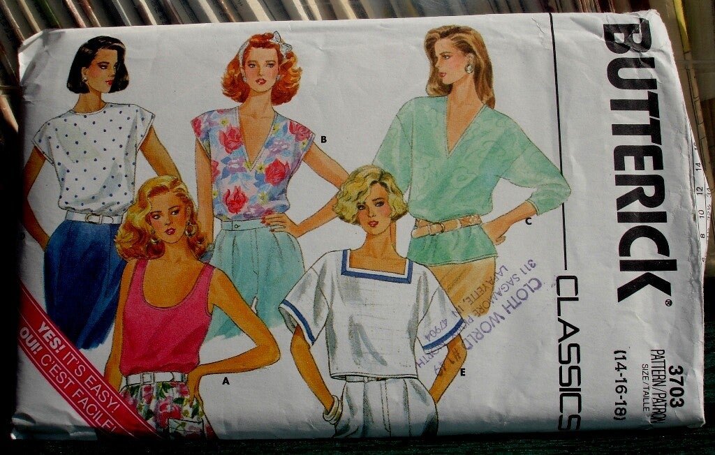 Relevent Tags: sewing pattern, Butterick 3703, misses pullover top, size 14-16-18, neckline and length variations, narrow hem, loose-fitting top, semi-fitted top, cutaway armholes, cap sleeves, long sleeves pushed up, above elbow sleeves, copyright 1986, Two Artisan Sisters,