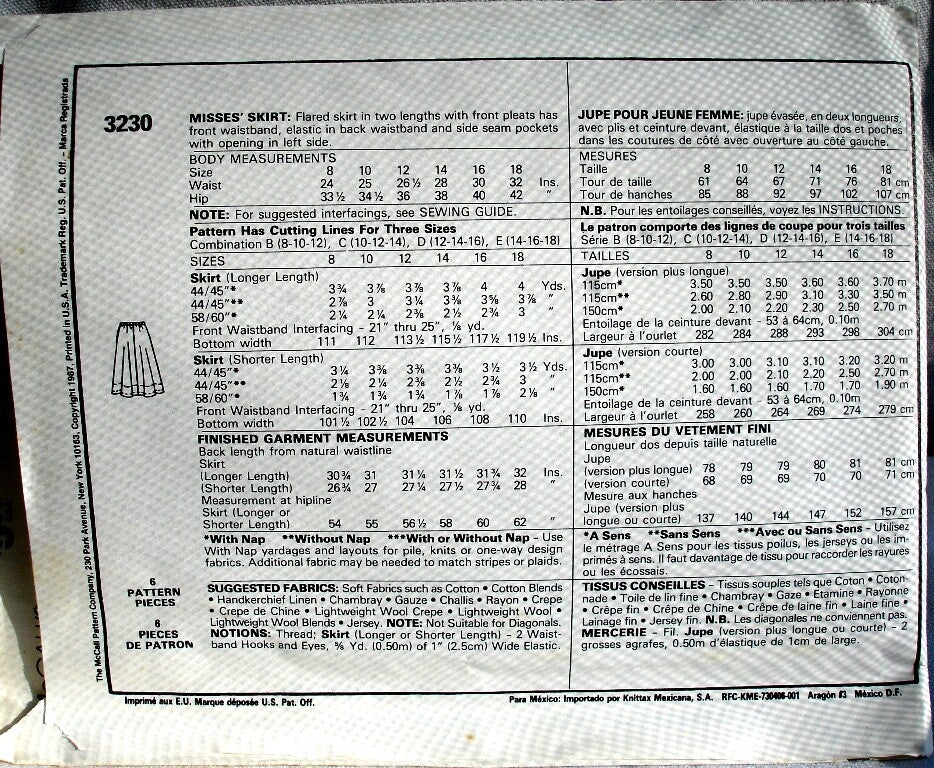 Relevent Tags: sewing pattern, McCall's 3230, size B (8-10-12), misses skirt pattern, flared skirt, slightly below knee length skirt , mid calf length skirt, front pleats, front waistband, elastic in back, side seam pockets, opening in left side, copyright 1987, Two Artisan Sisters,