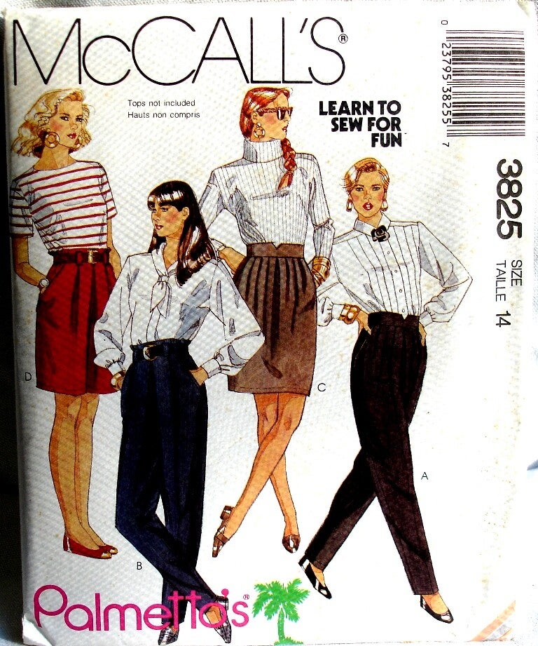 McCall's 3825, designed by Palmetto's, misses pants, misses skirt, misses shorts, size 14, front inset pockets, contrast waistband facings, back slit in skirt, pants and skirt have front pleats and back zipper opening, button waistband, partial elastic in waistline casing, belt carriers, copyright 1988, Two Artisan Sisters,