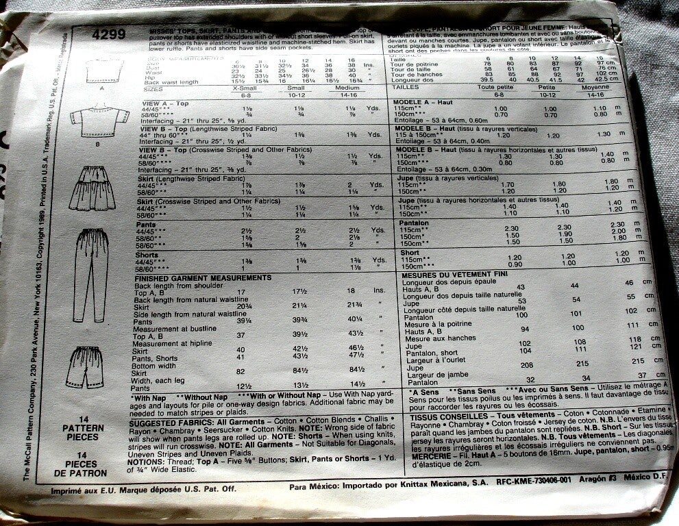 This great pattern makes misses tops, skirt, pants, and shorts. front buttoned cropped top or pullover top has extended shoulders, with or without short sleeves. Pull on skirt, pants or shorts have elasticized waistline and machine stitched hem. Skirt has lower ruffle. Pants and shorts have side seam pockets.